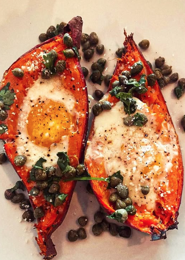 Baked Eggs in Sweet Potato Boats with Herb Relish